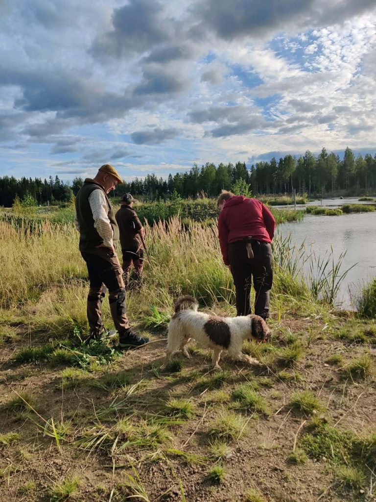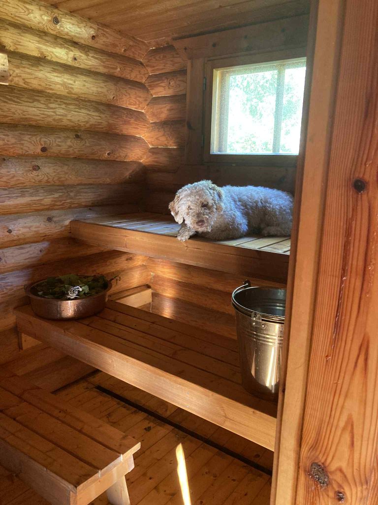 Kesällä Hilla kahlaa läpi ojat, järvet ja merenrannat, ja sen jälkeen onkin parasta mennä saunaan, siellä koira viihtyy aluksi lauteilla ja lopulta lauteiden alta vihjailemalla että lisää löylyä…. Talvella taas lumessa möyriminen ihan parasta mitä Hilla tietää.