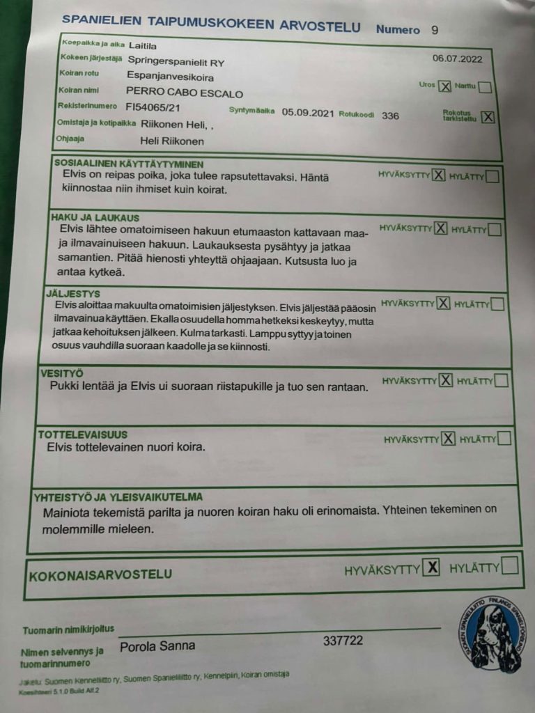 Harrastuksista mainittakoon : Elvis oli 10kk, kun suoritti Spanielien taipumuskokeen SPA1 ja sen innostamana ollaan treenailtu ja osallistuttu myös spanielien vesityökokeeseen. Mejä-kokeessakin ollaan käyty ja näissä on myös hänen laukausvarmuus tullut varmistettua useaan kertaan. Nosework ja BH-koetta varten on tullut myös treenailtua. Rallytokokisat on myös startattu. Näyttelyissäkin on tullut Elviksen kanssa käytyä ja hän on yhtä sertiä vaille Viron muotovalio ja yhden sertin saanut myös Suomessa.